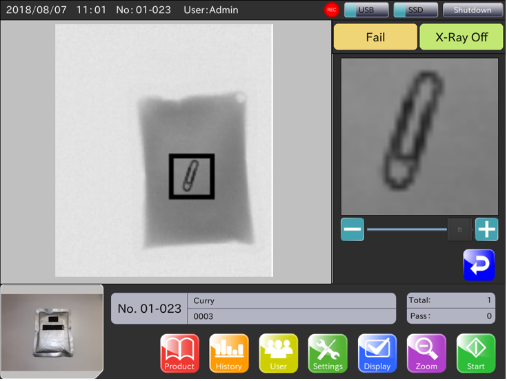 X-ray inspection systems pass high energy X-ray beams through material and the detecting result is displayed visually in image form on the HMI touchscreen display. The denser the material inspected, the darker the resulting image will be.Contaminant results are determined by special algorithms that compare differing contrasts received from the detector.